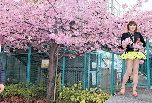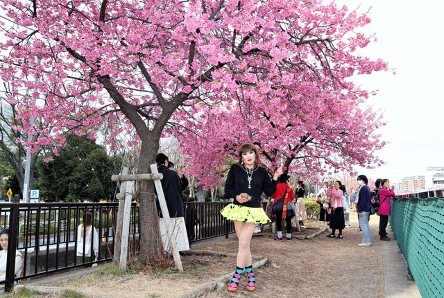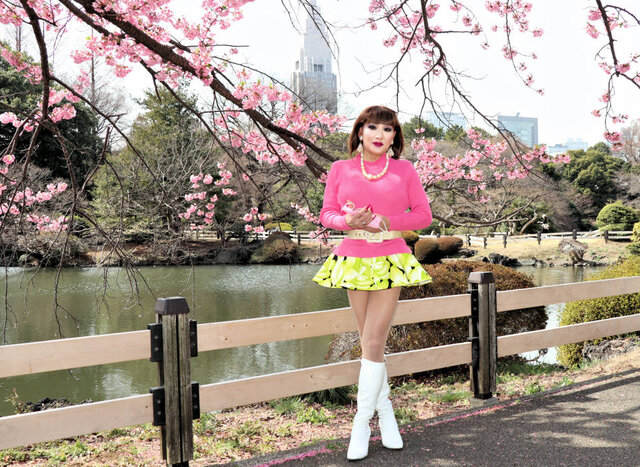 今日の留美子さんは、レモンイエローの花柄ミニスカと白のロングブーツ姿。トップスは、桜に合わせてピンクでコーディネートしています。