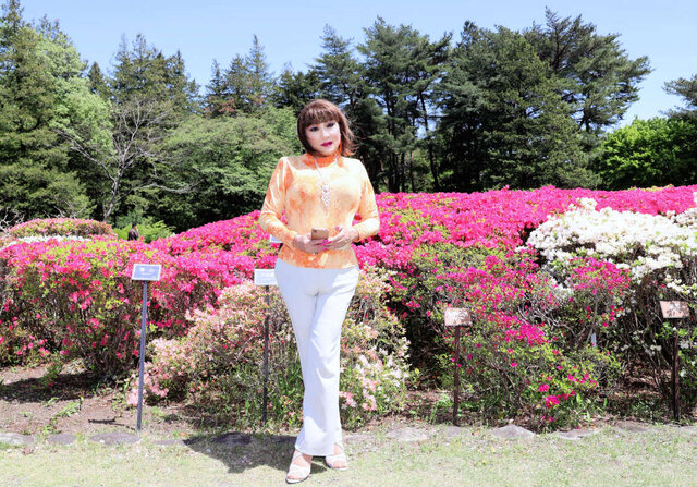 正式名は祇園山安養院長楽寺。安養院は、北条政子の法名でもあります。全山満開のオオムラサキツツジ。通称「おばけツツジ」鮮やかな赤紫色の絶景をご覧下さい。留美子さんのシンプルながらファッショナブルなスタイルも素敵ですねえ。オオムラサキと共に、華麗に艶やかに咲き誇っています。(Fine beautiful)
