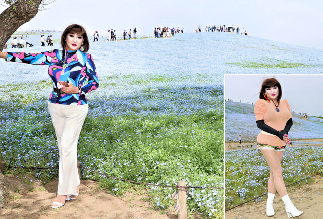 TV等でよく紹介される、全国的に有名なネモフィラ畑。茨城ひたち海浜公園。青い絨毯を敷き詰めたような美しい光景です。今日の留美子さんは、青を基調としたカラフルトップスにパンツスタイル。爽やか留美子さんと空とネモフィラのブルーワールド。素晴らしいですね。