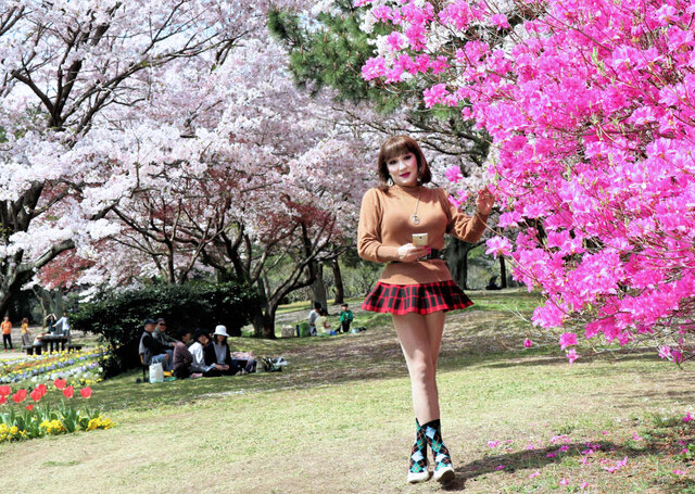 「桜とツツジとチューリップ」奇蹟の一枚でしょうか。感動的です。愛用の単色トップスにチェックミニスカ。足元はソックス重ね履きのカバコ。まさにこれぞ代表的な留美子式スタイル。桜とツツジとチューリップの三重奏によーく映えていますね。